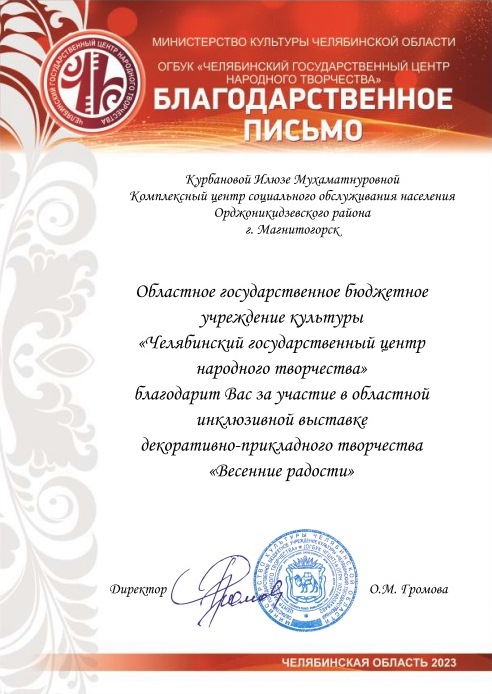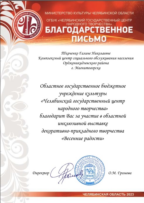 Организаторы выставки отметили рукодельниц, участвовавших в выставке от отделения дневного пребывания Орджоникидзевского района, прислав благодарственные письма на адрес центра.
