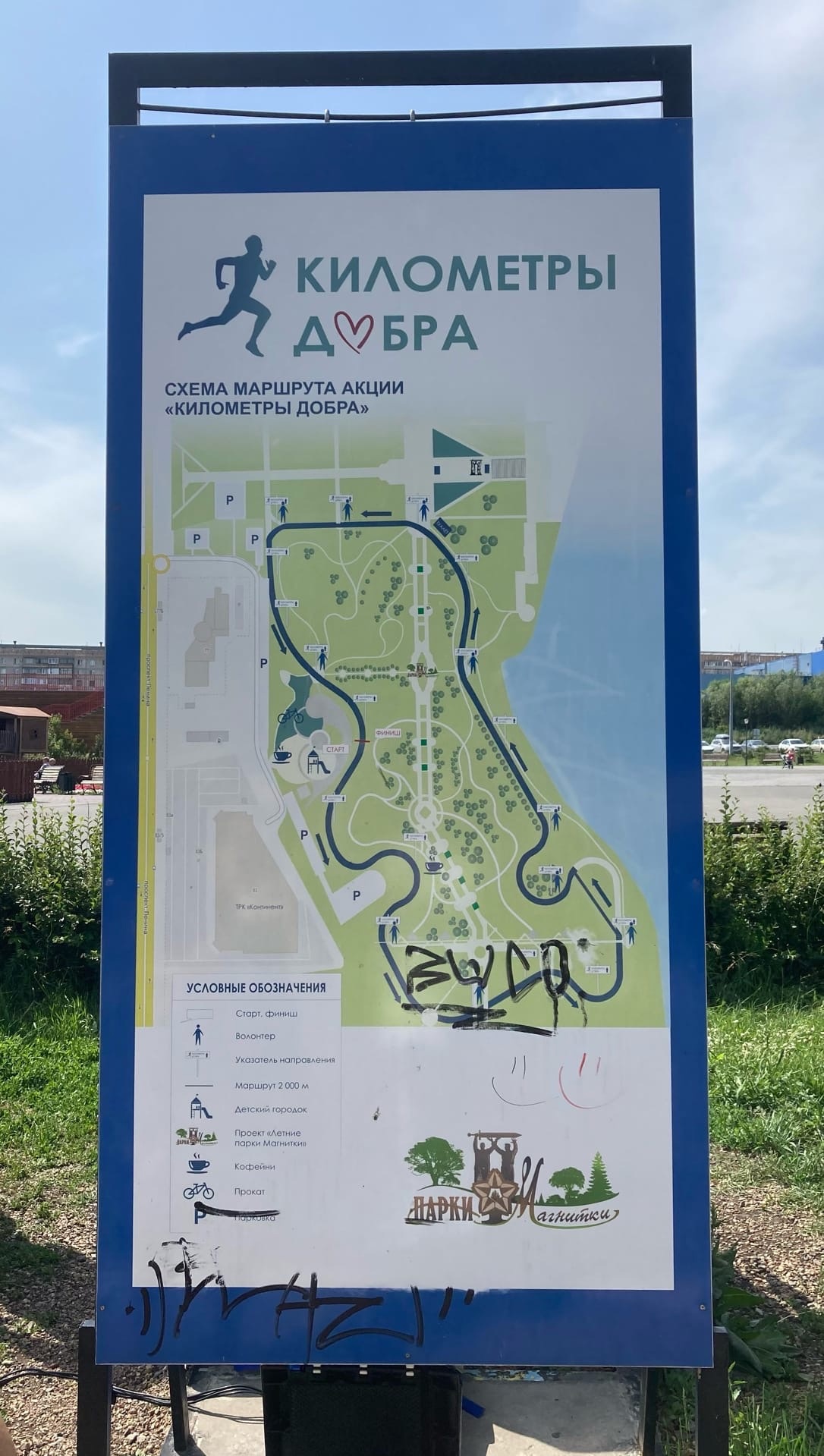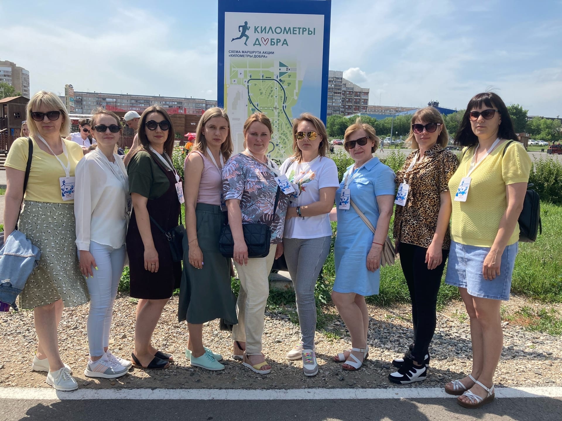 Наша дистанция составляла один километр. Ее можно было пробежать или пройти. Каждому участнику выдали бейдж с меткой «Километры добра» и номером, который был получен в обмен на чек с денежным взносом. Затем все вышли на дистанцию. Старт и финиш был у детской игровой площадки.