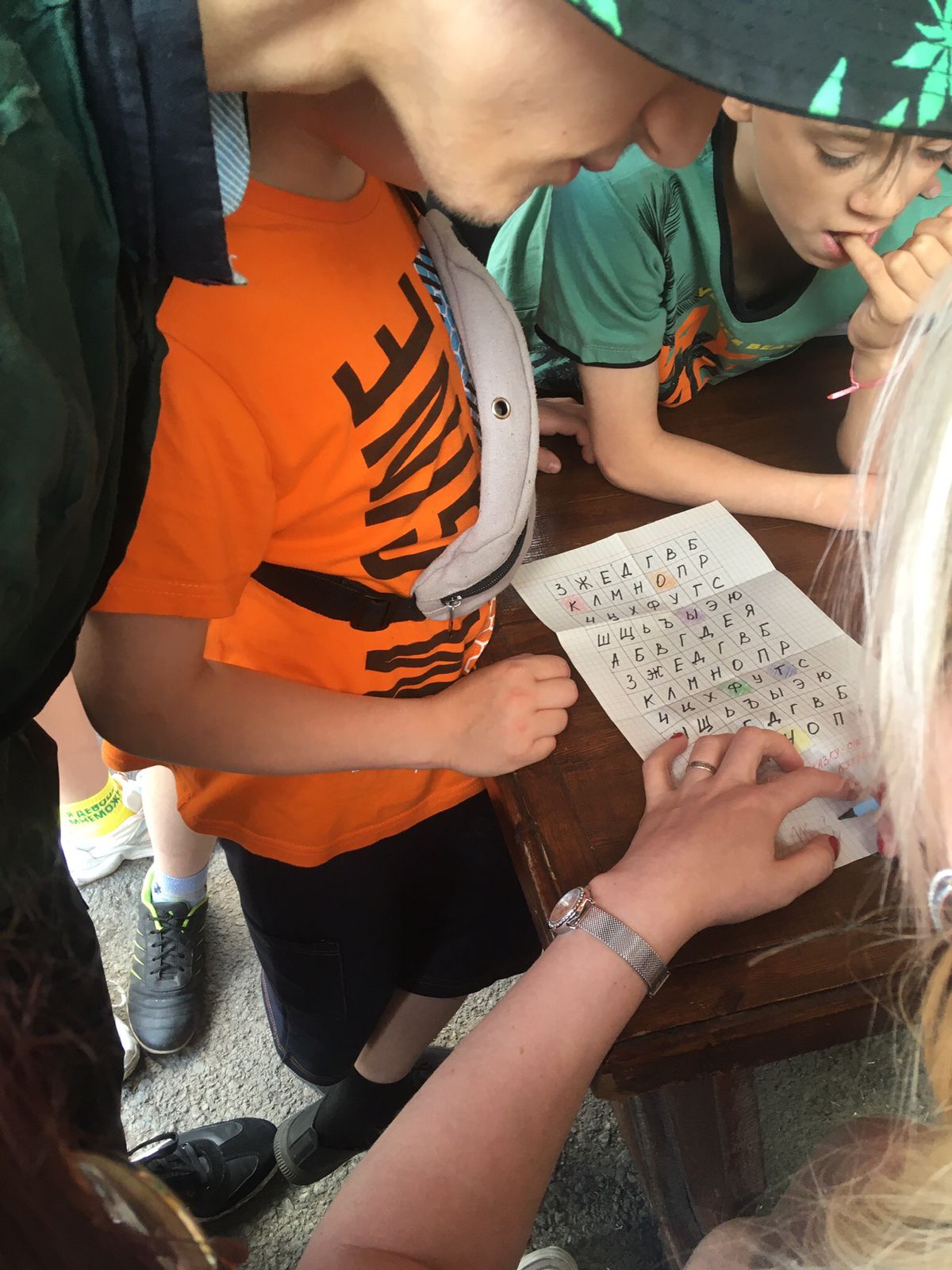 Ребята получили записку, где с помощью цифро-буквенного кода было зашифровано место нахождения следующей подсказки. Воспитанники с легкостью справились с заданием, но подсказку всё-таки пришлось поискать! Ведь она была спрятана под деревом! Были осмотрены практически все деревья территории школы-интерната, и тайник был найден!