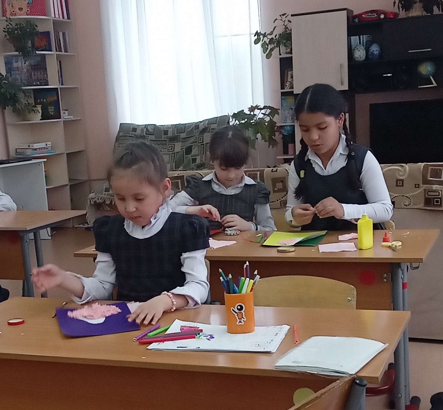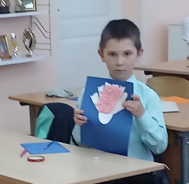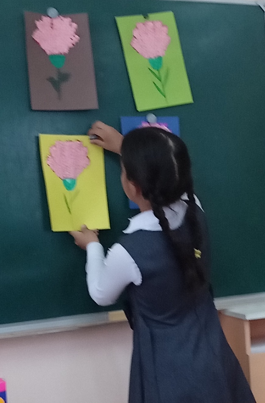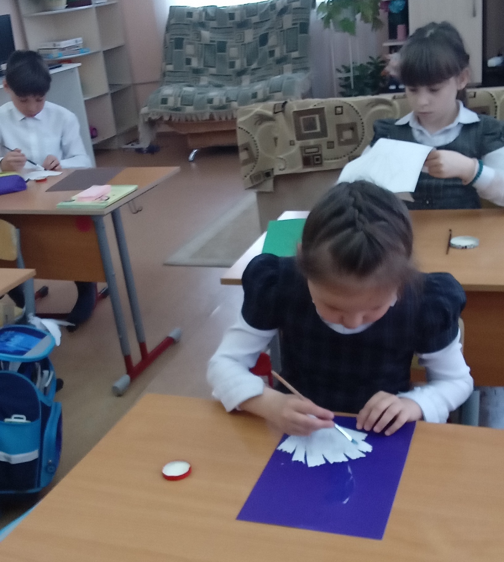 Первоклассники получили шаблон цветка, а третьеклассники вырезали изделие сами. Контур цветка наклеили на картон; лепестки оформили салфетками, отрывая маленькие кусочки и обмакивая их в клей. Такая работа ученикам понравилась.