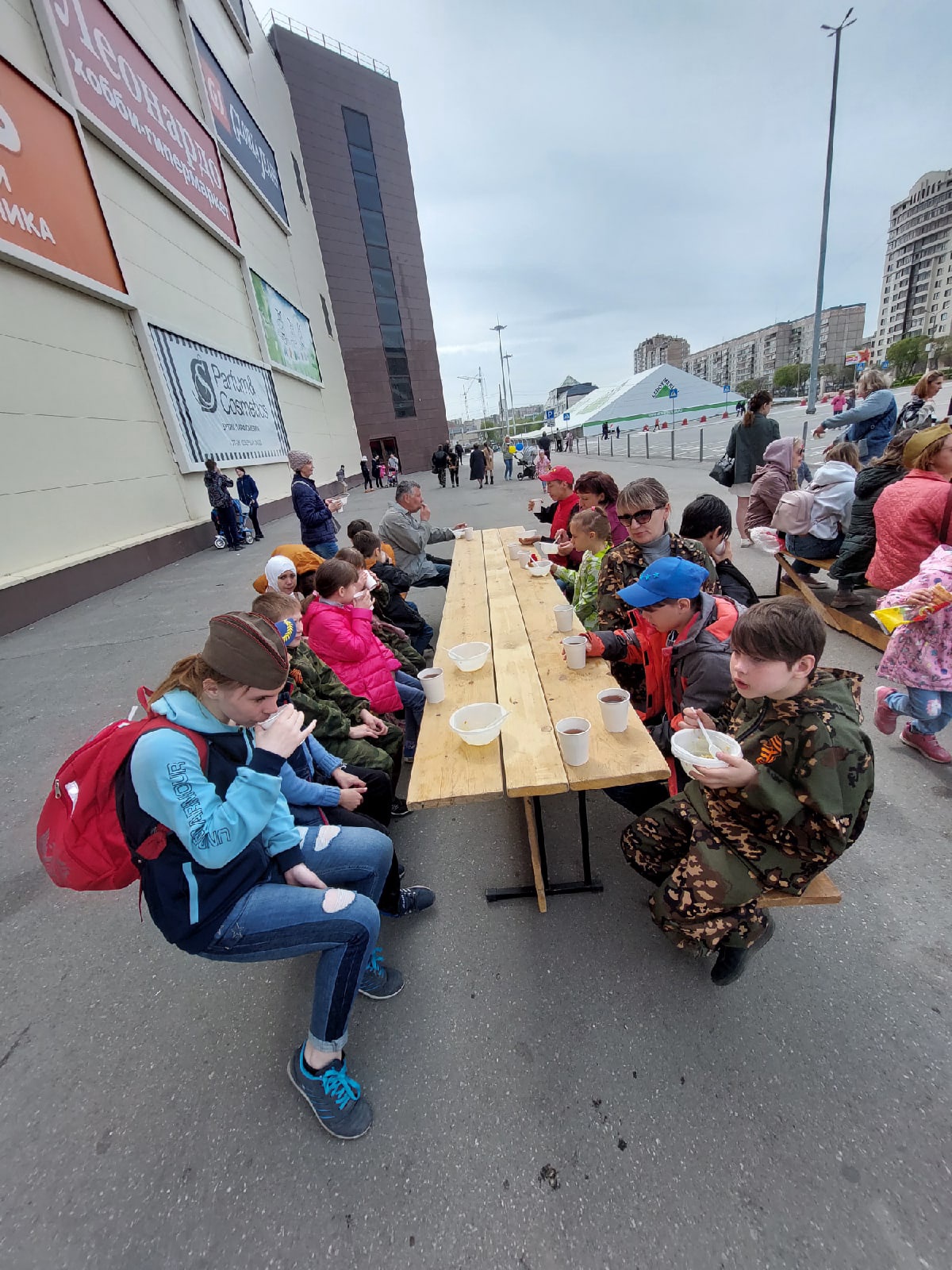 Как всегда, после парада жители города попробовали вкусную кашу полевой кухни. Нашим ребятам военная каша очень понравилась.