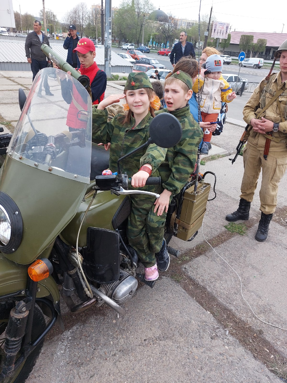 Впервые на параде были наши воспитанники - брат с сестрой, Дима и Люда. Ребят очень заинтересовала военная техника, и ее представители рассказали о ней и даже разрешили детям посидеть на мотоциклах и воспользоваться рацией.