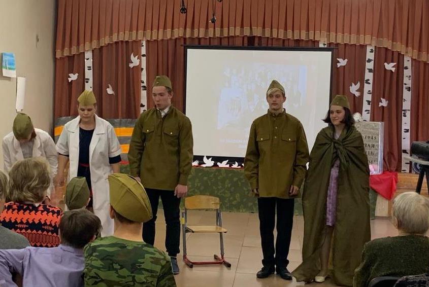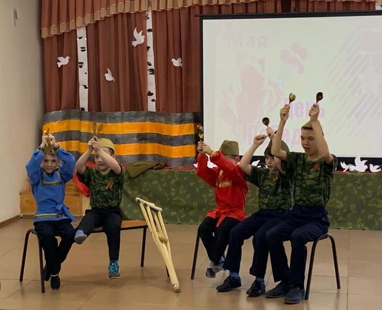 Ребята пели военные песни, рассказывали стихи, играли на ложках. Очень искренно и пронзительно прозвучала театрализованная сценка "На стенке фото пылится".