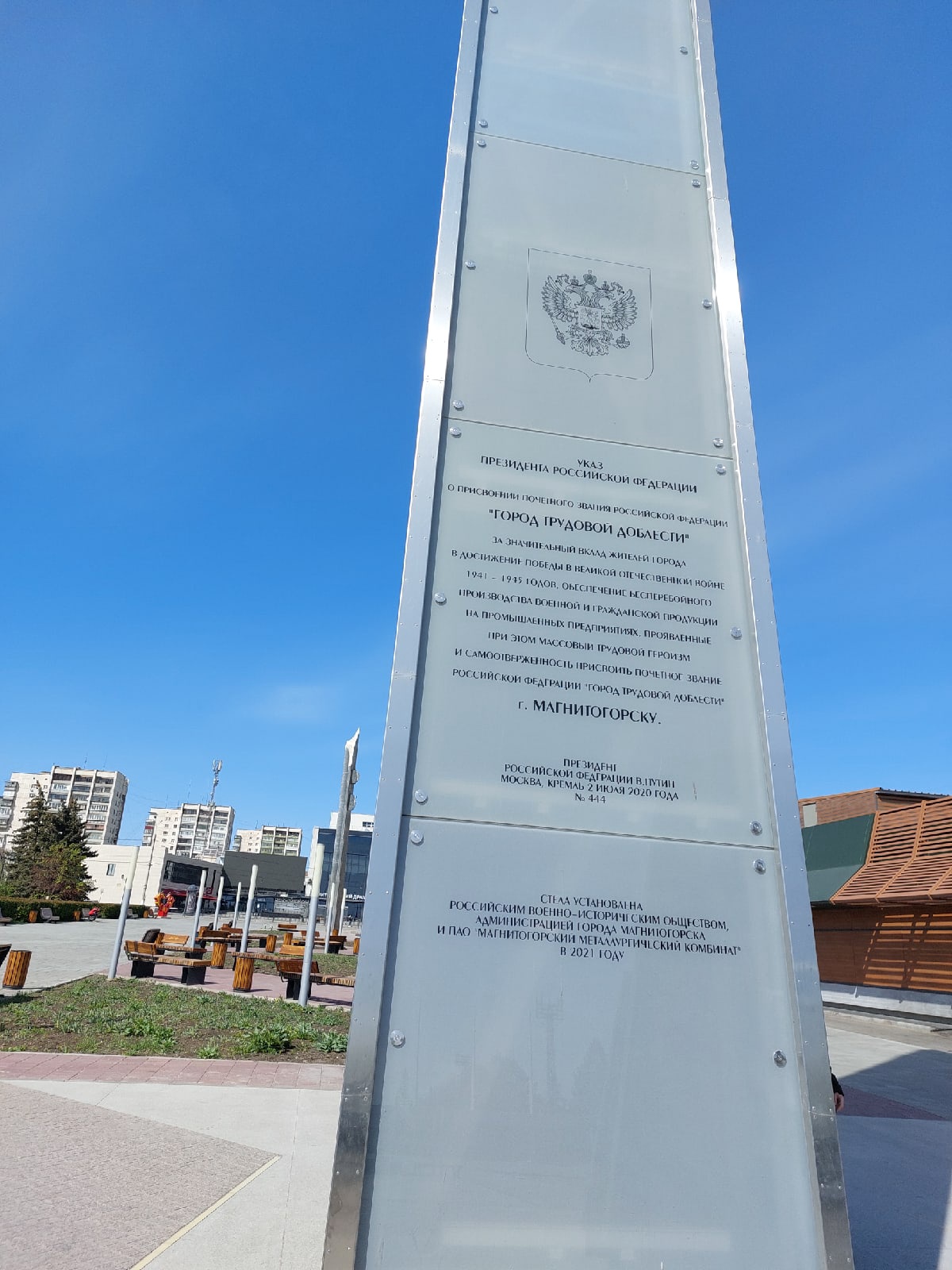 Урок проходил возле стелы "Город трудовой доблести": это звание наш город получил в июле 2020 года указом президента РФ.