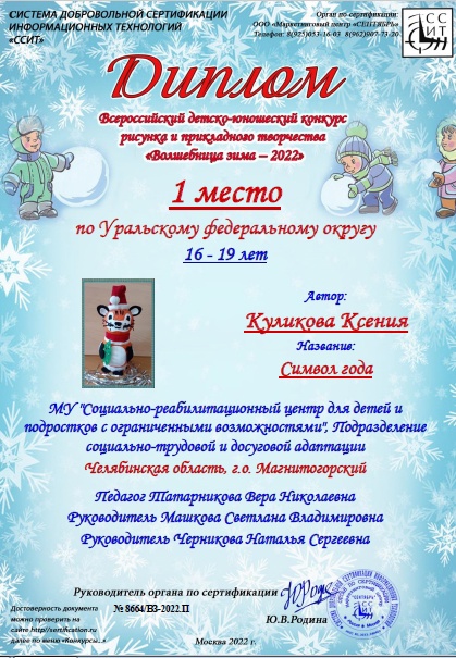 Педагоги дополнительного образования МУ «Социально-реабилитационный центр для детей и подростков с ограниченными возможностями» г. Магнитогорска участвуют не только в очных, но и в дистанционных конкурсах. Подведены итоги Всероссийского детско-юношеского конкурса рисунка и прикладного творчества "Волшебница зима - 2022". Поздравляем Королева Назара и Куликову Ксению! Творите, дерзайте, удачи и новых побед!!!