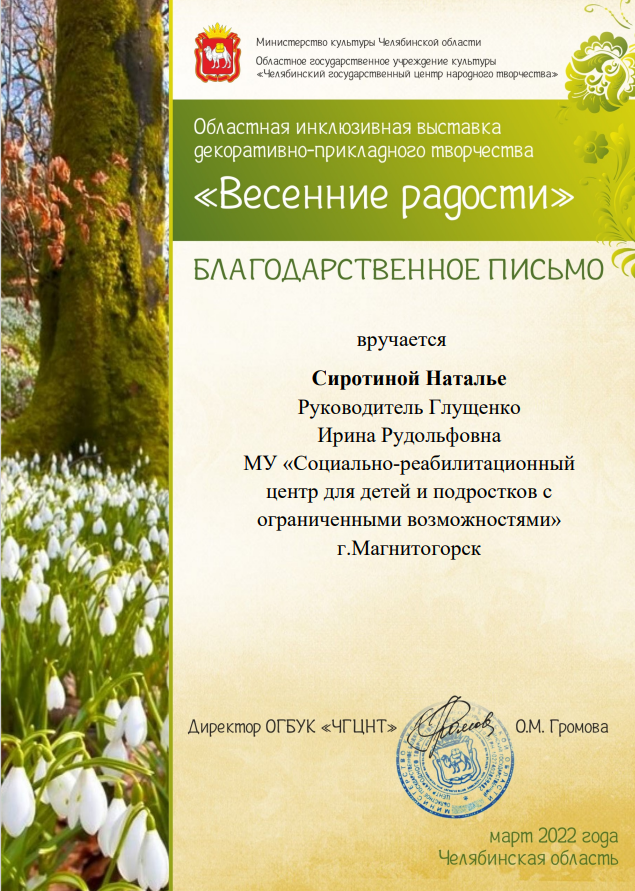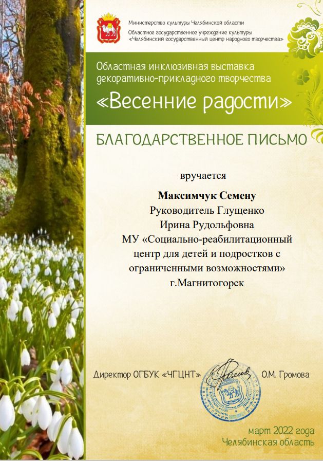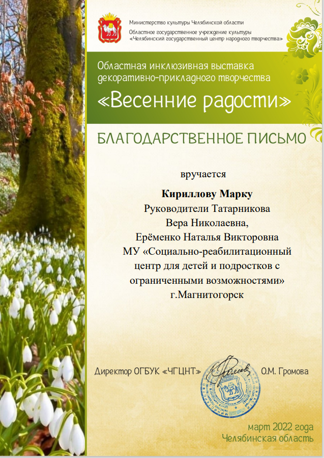 С 01.03 по 31.03.2022 в Челябинском государственном центре народного творчества, в группе Грани творчества, проходила выставка декоративно-прикладного творчества «Весенние радости». Воспитанники МУ «Социально-реабилитационный центр для детей и подростков с ограниченными возможностями» г. Магнитогорска приняли в ней активное участие. Благодарим ребят и педагогов за творчество!!!