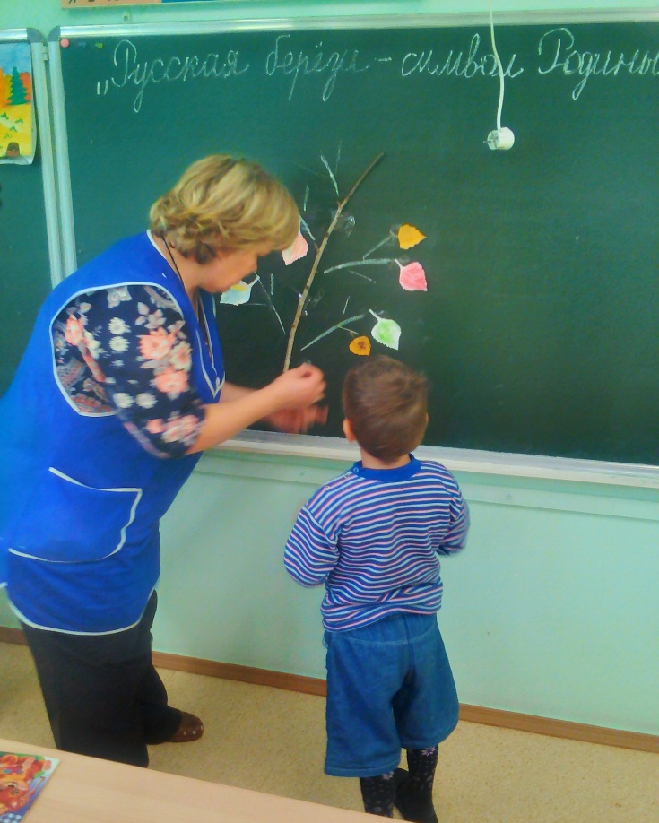 В группе дошкольников школы-интерната № 5 прошло интересное занятие по теме «Русская берёза – символ Родины моей». Ребята занимались «научной» работой: изучали кору берёзы, ее листочки. Раскрашенные в осенний цвет бумажные листочки украсили силуэт берёзки, который был прикреплен на школьной доске в группе. Ещё проводили опыт с берестой, опуская её в воду, проверяя на влагостойкость, делали берестяные колечки. Среди деревьев на территории школы - интерната нашли берёзу и поводили вокруг неё хоровод, напевая песню «Во поле берёза стояла».