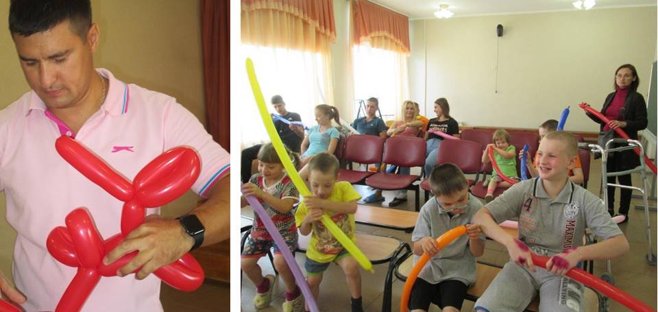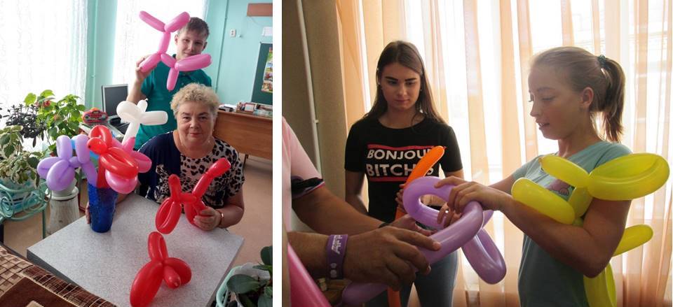 На этот раз он устроил для детей мастер-класс по моделированию из воздушных шаров (скручиванию шариков-колбасок в разнообразные формы) фигурок животных, цветов, шпаг и др.