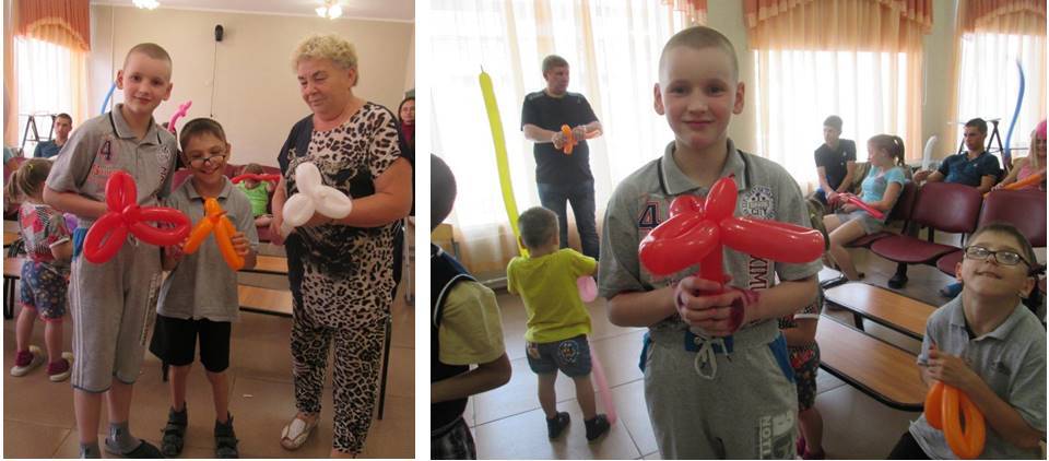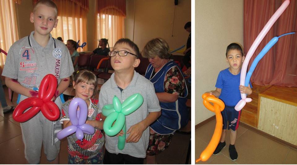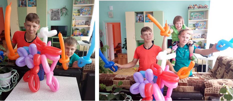 Старшие дети дарили свои поделки малышам, от чего те выражали бурный восторг. Самая маленькая Верочка больше всех радовалась подарку. Илья сделал замечательную собачку. Старшие девочки – Ирина и Милена – легко справлялись с скручиванием шаров. Ребята с ограниченными возможностями здоровья – Эдик и Максим – очень старались, и шарики поддались их мастерству.