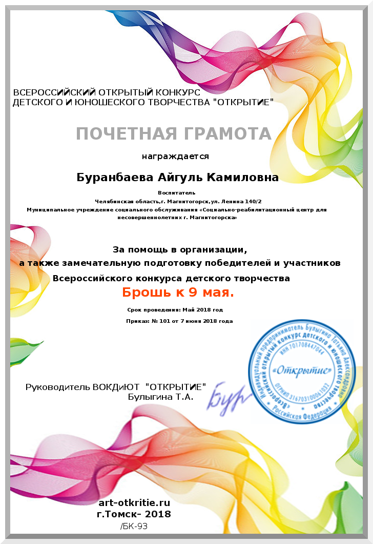 В этот раз 1 место занял Стасюк Сергей – воспитанник Центра, который выполнил работу в необычной для мальчика технике – «вышивка крестиком». Данную работу воспитанник выполнил под руководством Буранбаевой Айгуль Камиловны – воспитателя Центра.