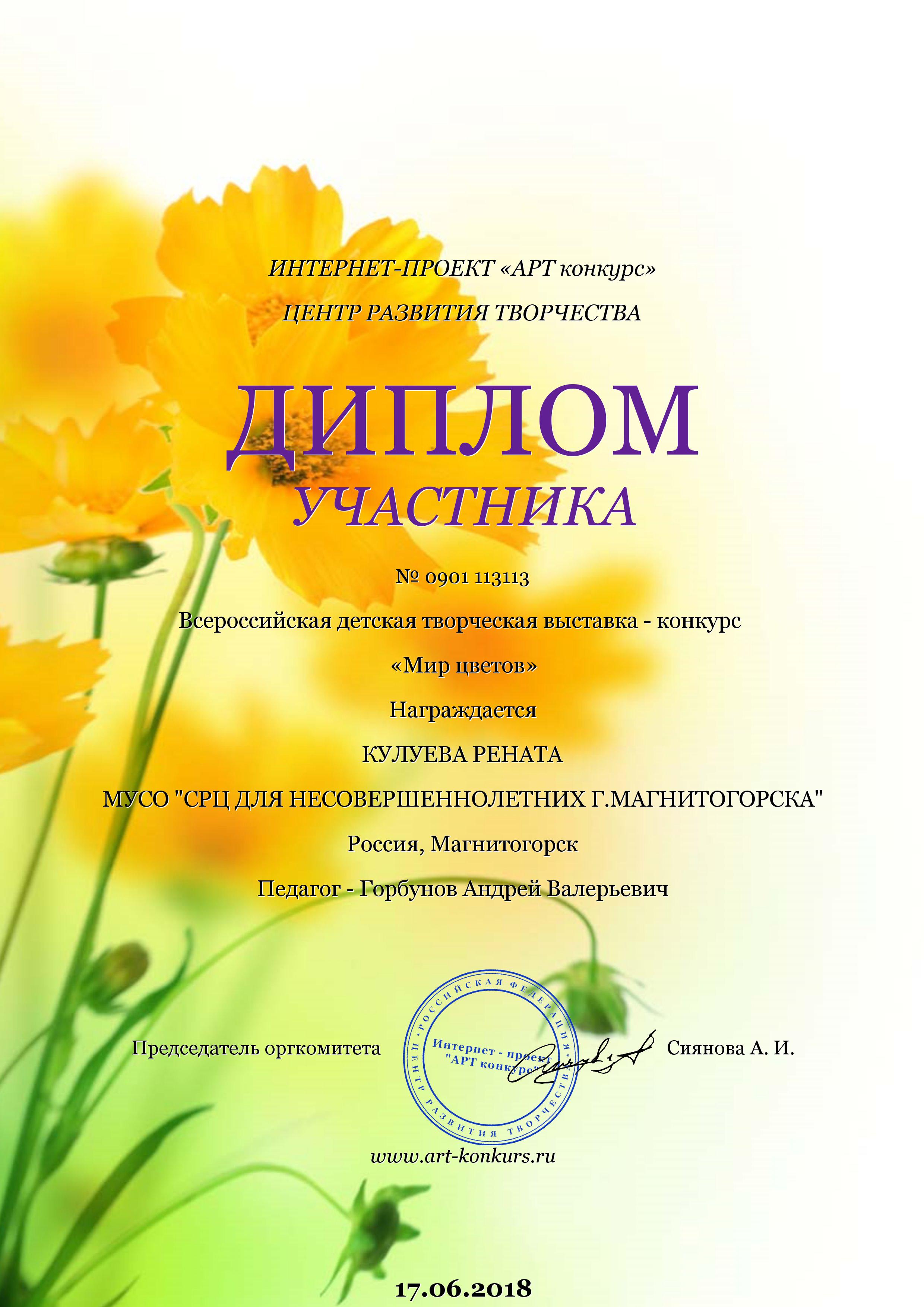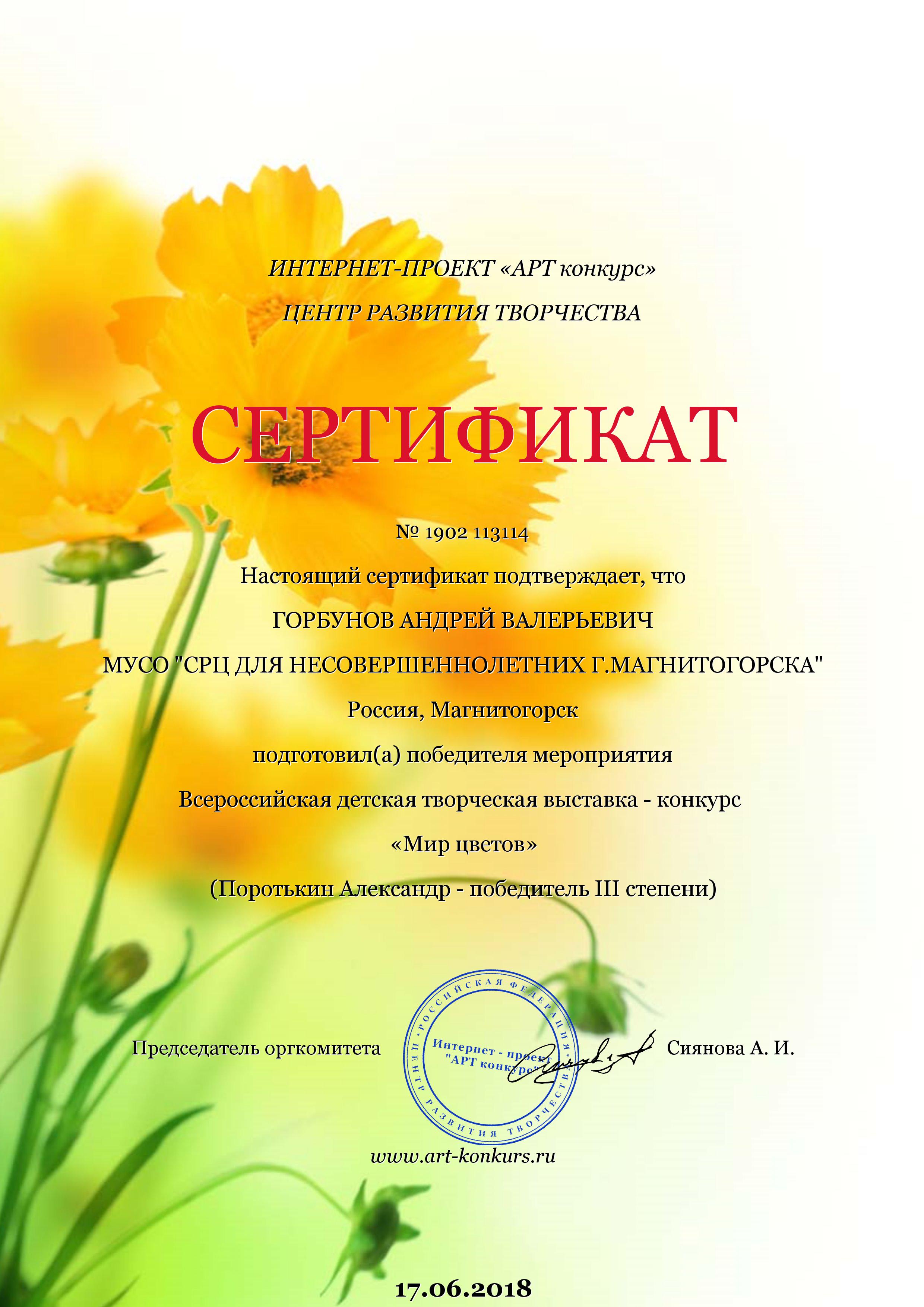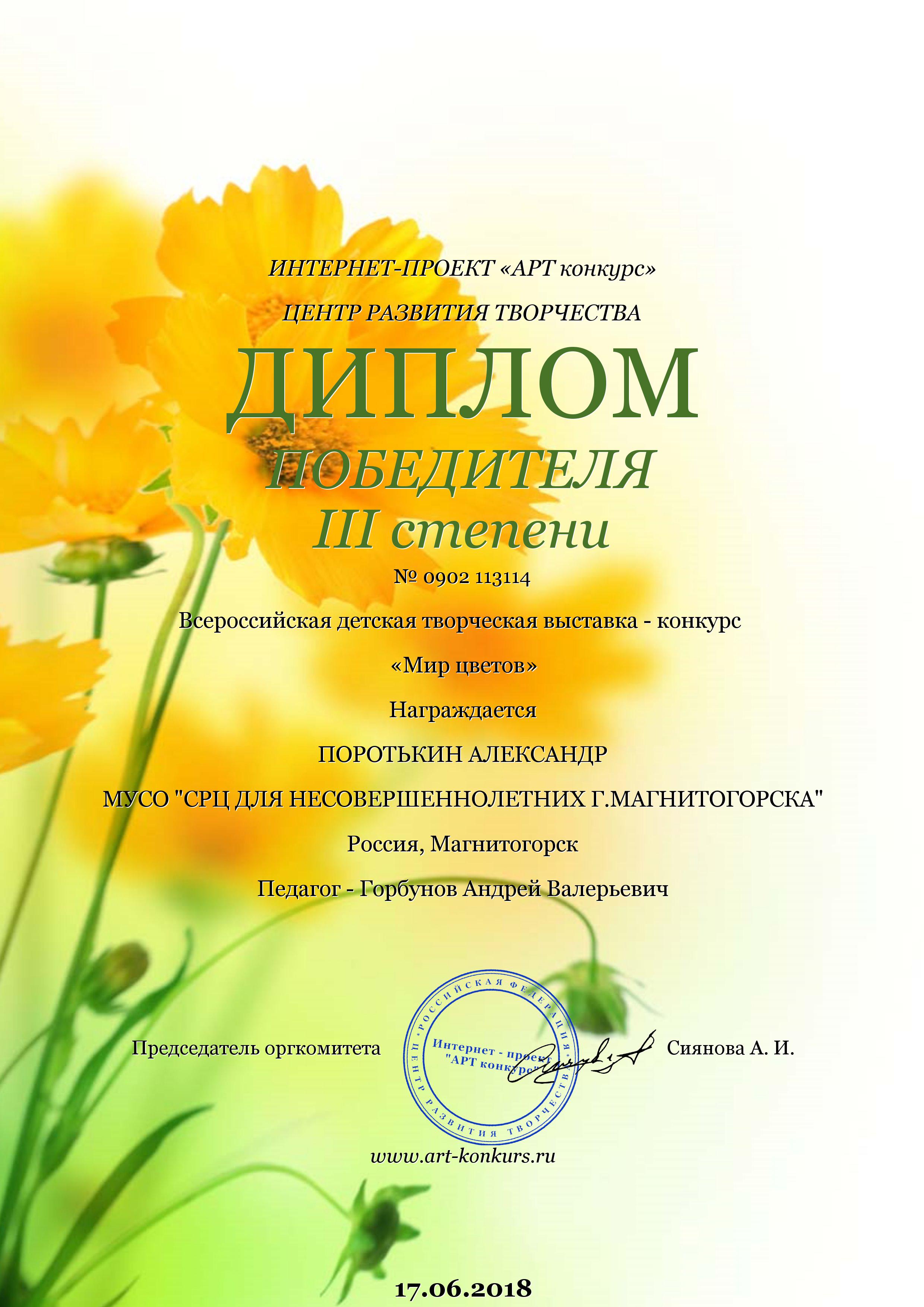 Дипломом за 3 место был награжден Поротькин Александр, участвующий в номинации «фотография». В этой же номинации участвовала Кулуева Рената – она получила диплом участника. Участников выставки подготовил Горбунов Андрей Валерьевич – воспитатель Центра.