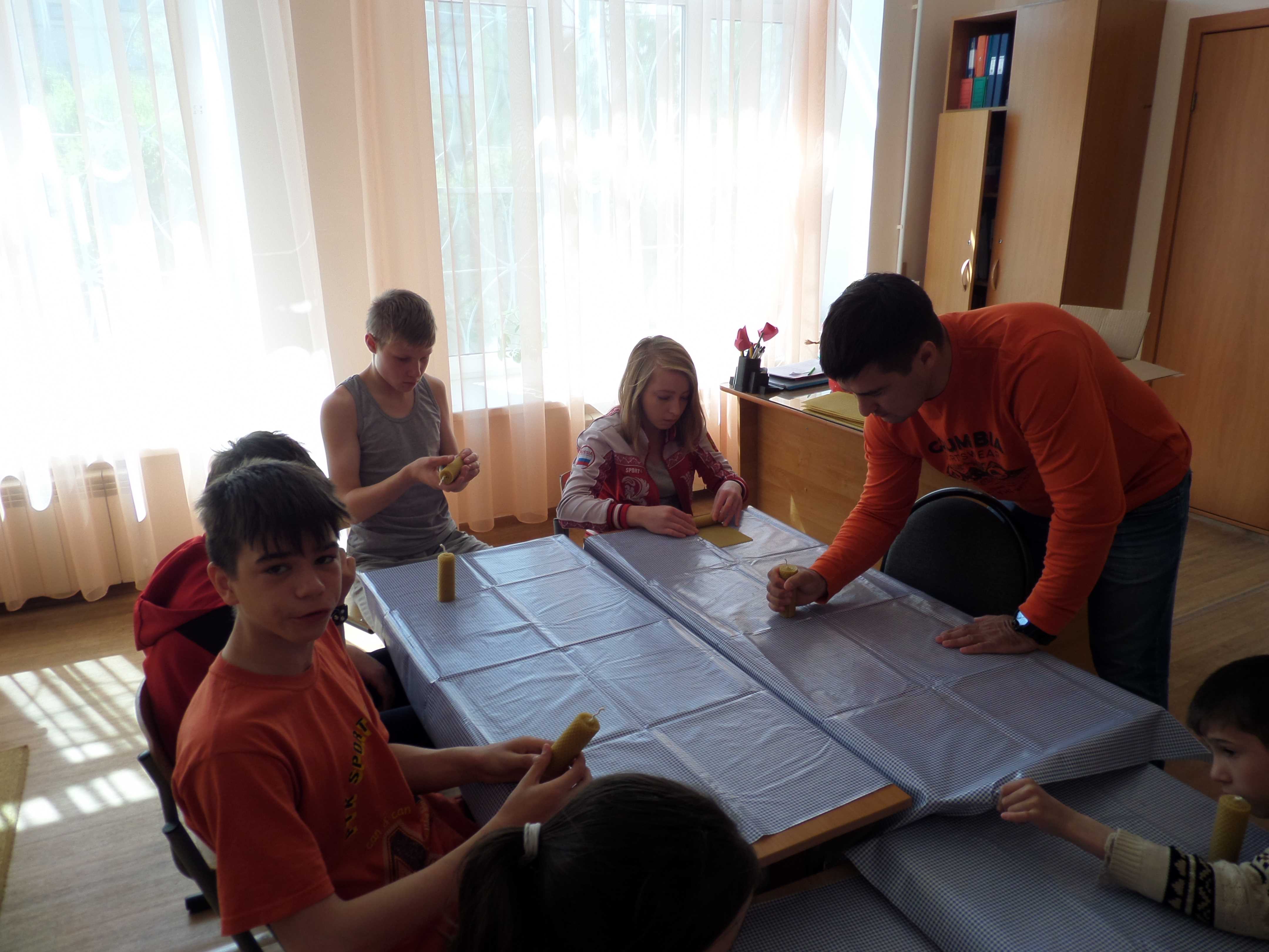 Вместе с волонтером А.О. Шутовым наши воспитанники в возрасте 5-16 лет изготовили своими руками восковые свечи.
