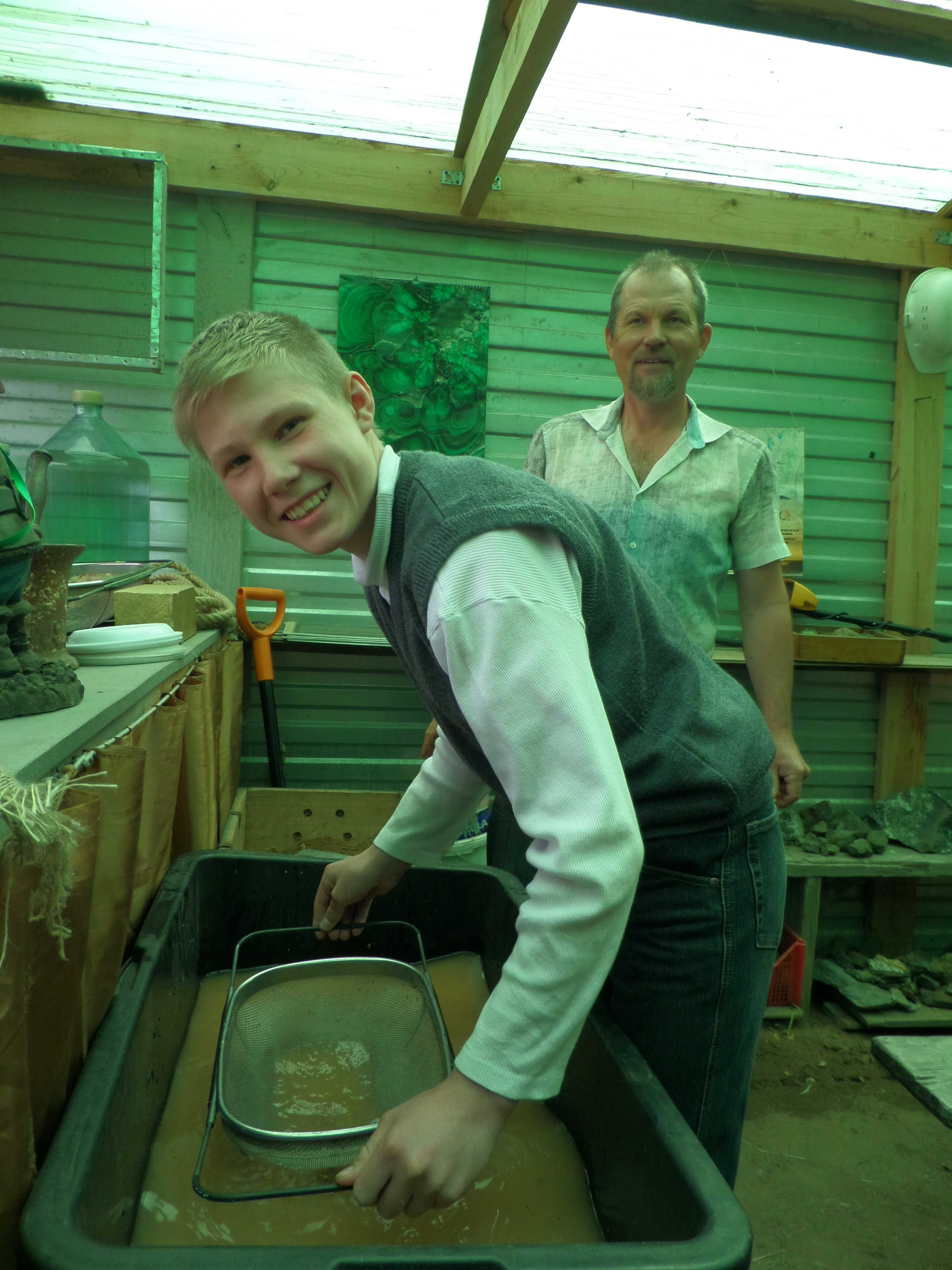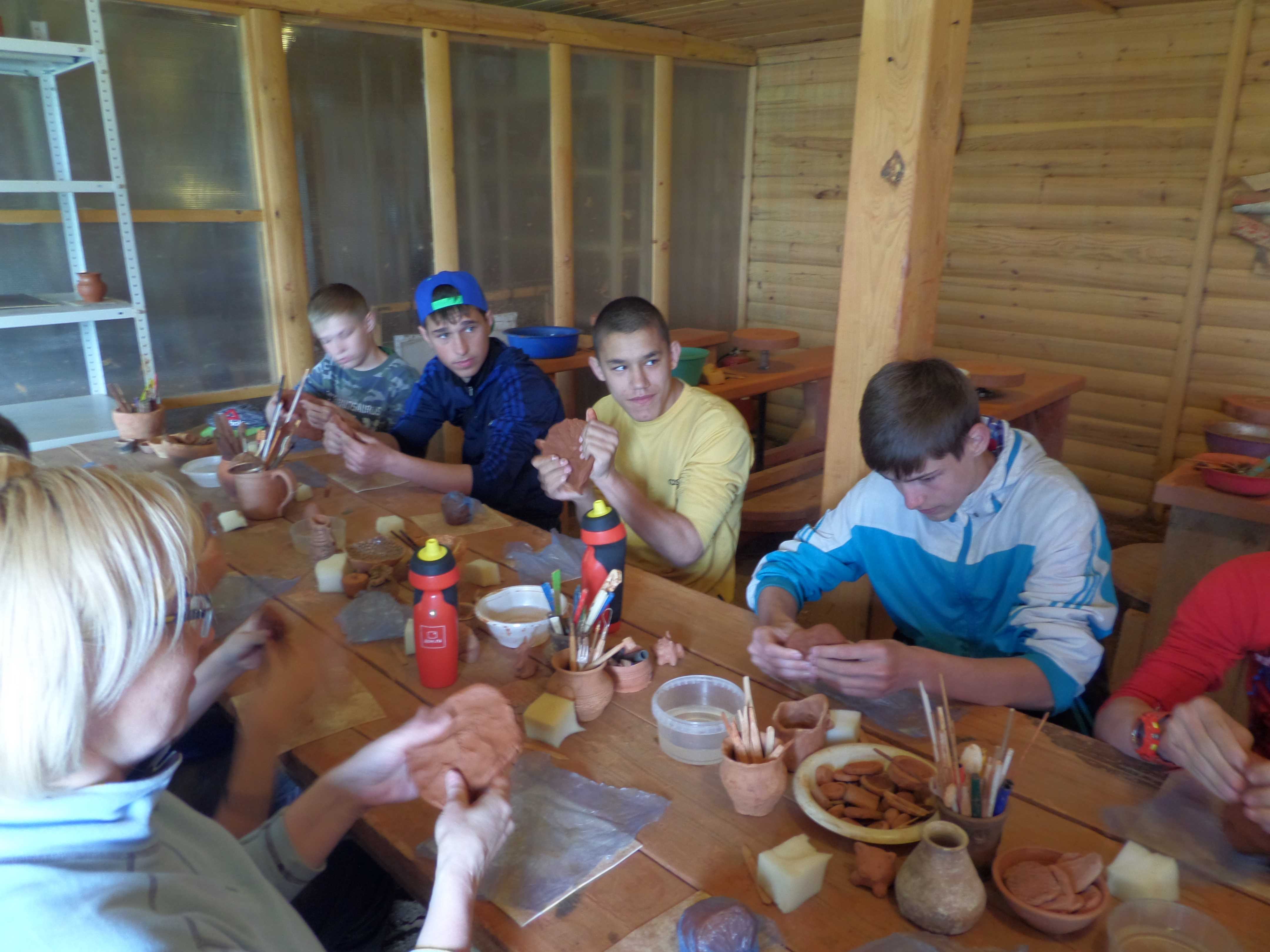Путешествие продолжилось. И мы отправились в настоящую мастерскую по изготовлению поделок из глины. Каждый из мальчишек своими руками слепил из красной глины поделку по замыслу: черепашку, горшочек, тарелку, кувшин и пр., а на память от экскурсовода получили медальоны с изображением Аркаима.