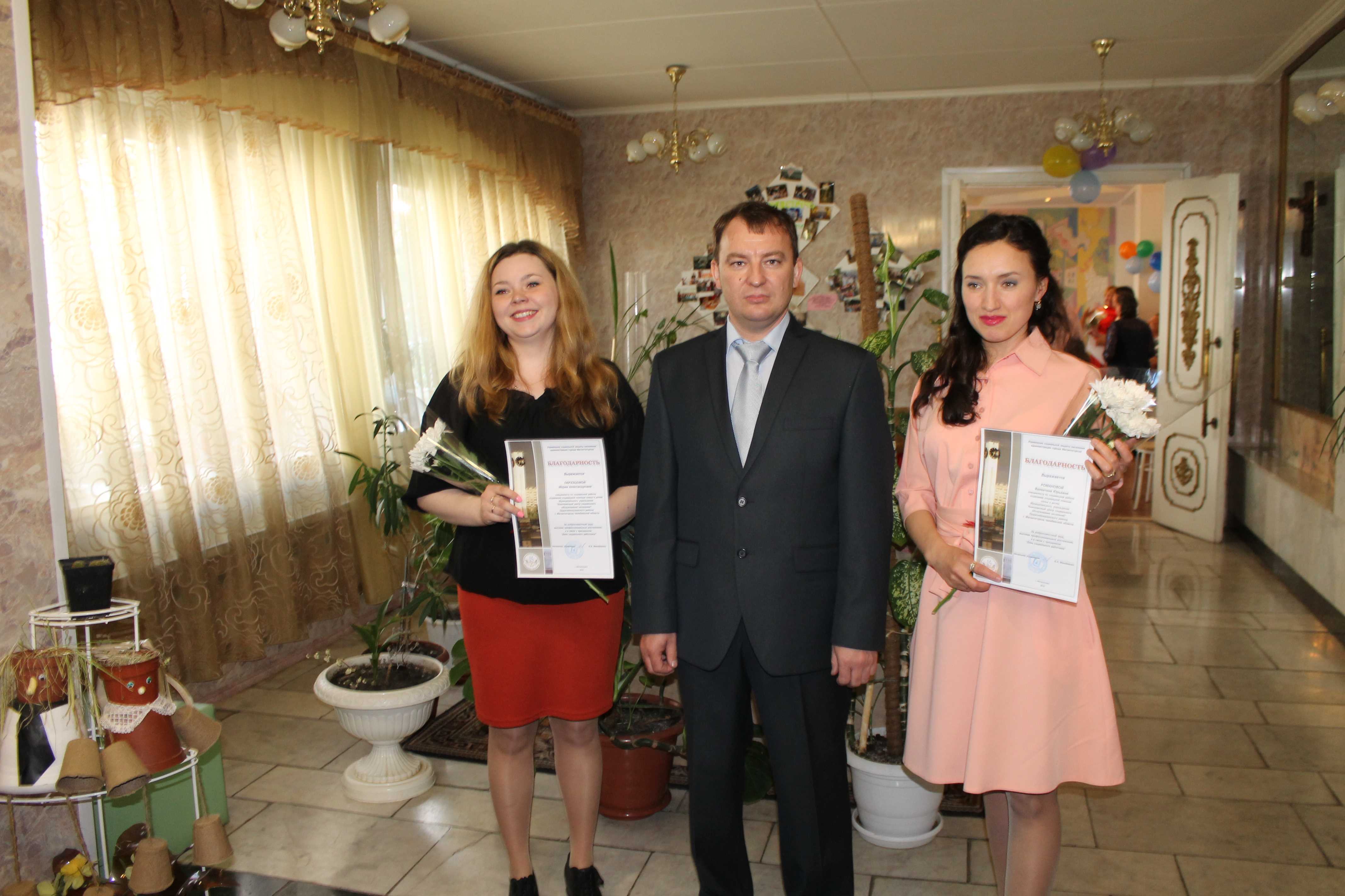 В МУ «Комплексный центр социального обслуживания населения» Орджоникидзевского района г. Магнитогорска Челябинской области проведено праздничное мероприятие впреддверии профессионального праздника. Для сотрудников учреждения было организовано праздничное мероприятие. Звучали поздравления директора Центра Шигапова Р. Ф., 15 сотрудникам учреждения - социальным работникам и специалистам по социальной работе были вручены Почетные грамоты и Благодарственные письма от Министерства социальных отношений Челябинской области, Главы города Магнитогорска, Управления социальной защиты населения. Кроме того, учреждение ежегодно принимает участие в конкурсе профессионального мастерства «Лучший работник социальной сферы Челябинской области», в текущем году в номинации «Лучший заведующий отделением учреждения социального обслуживания» Челябинской области - 2 место!!! В этом году заведующий отделением социального обслуживания на дому №1, стала лауреатом премии Законодательного собрания Челябинской области!!! И мы гордимся достижениями наших коллег! Для сотрудников Центра незабываемые и эмоционально яркие впечатления подарили в этот день детские коллективы: школа танцев «Оникс», ансамбль современной хореографии «Браво», юная исполнительница песен Валерия Клюшина и, конечно же, незаменимый баянист Дмитрий Пономарев.