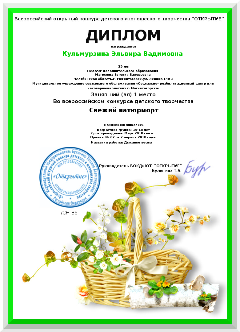 На конкурс была отправлена работа воспитанницы Кульмурзиной Эльвиры, которая прошла предварительный конкурсный отбор в Центре. Творческая работа получила название «Дыхание весны» и была выполнена в смешанной изо-технике. Итогом скрупулезной работы девочки стала победа в номинации «Свежий натюрморт».