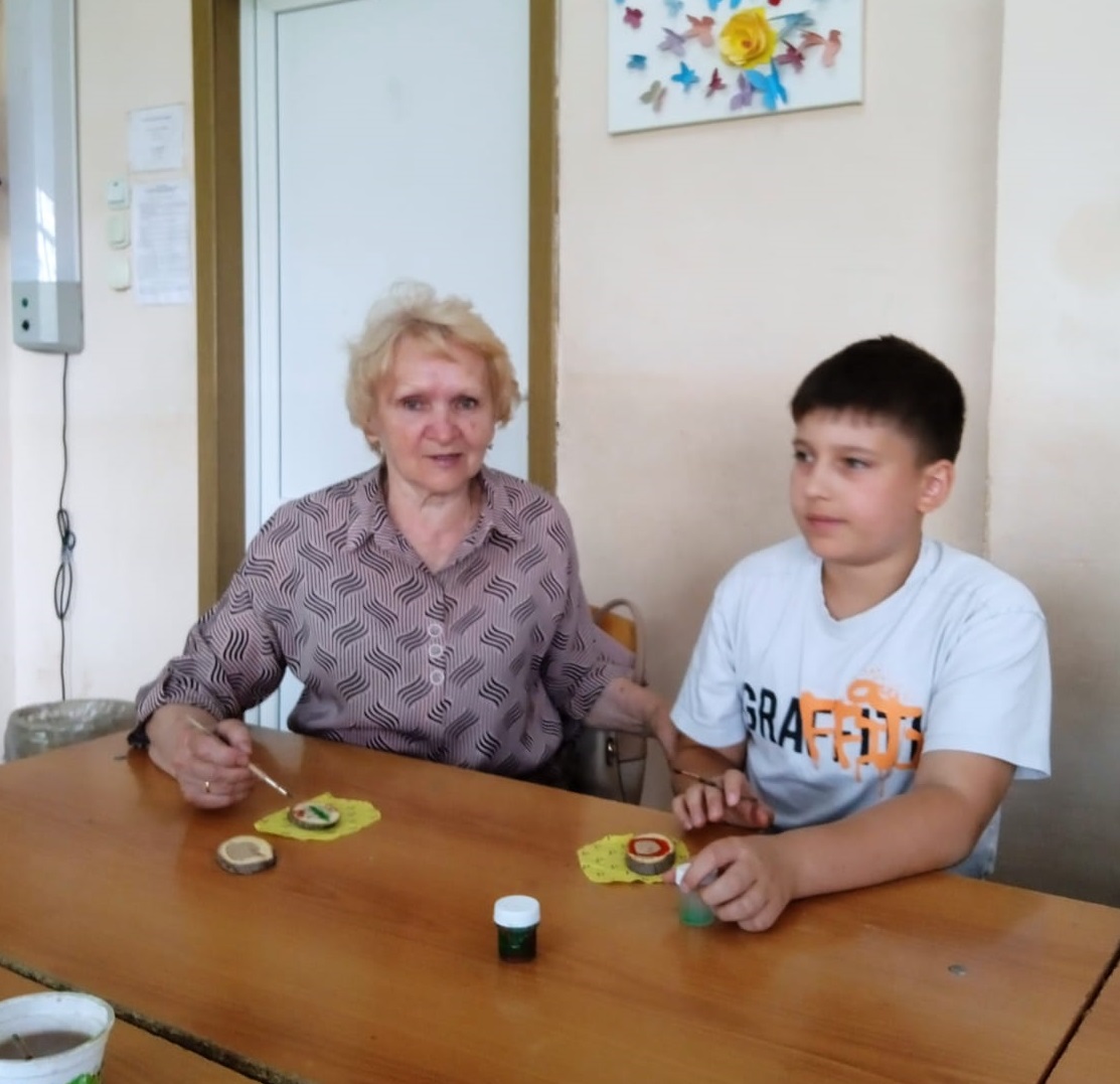 Но на этом встреча с ветеранами не закончилась. Валентина Павловна Татаркина провела два мастер-класса. Ребята рисовали на спиле (срез древесины) и собирали из подручных материалов куколку-оберег. Мальчишки и девчонки проявили талант, фантазию, каждый ушёл домой со своей поделкой. Около 60 детей приобрели новые навыки, а оберег будет им помогать в будущем.